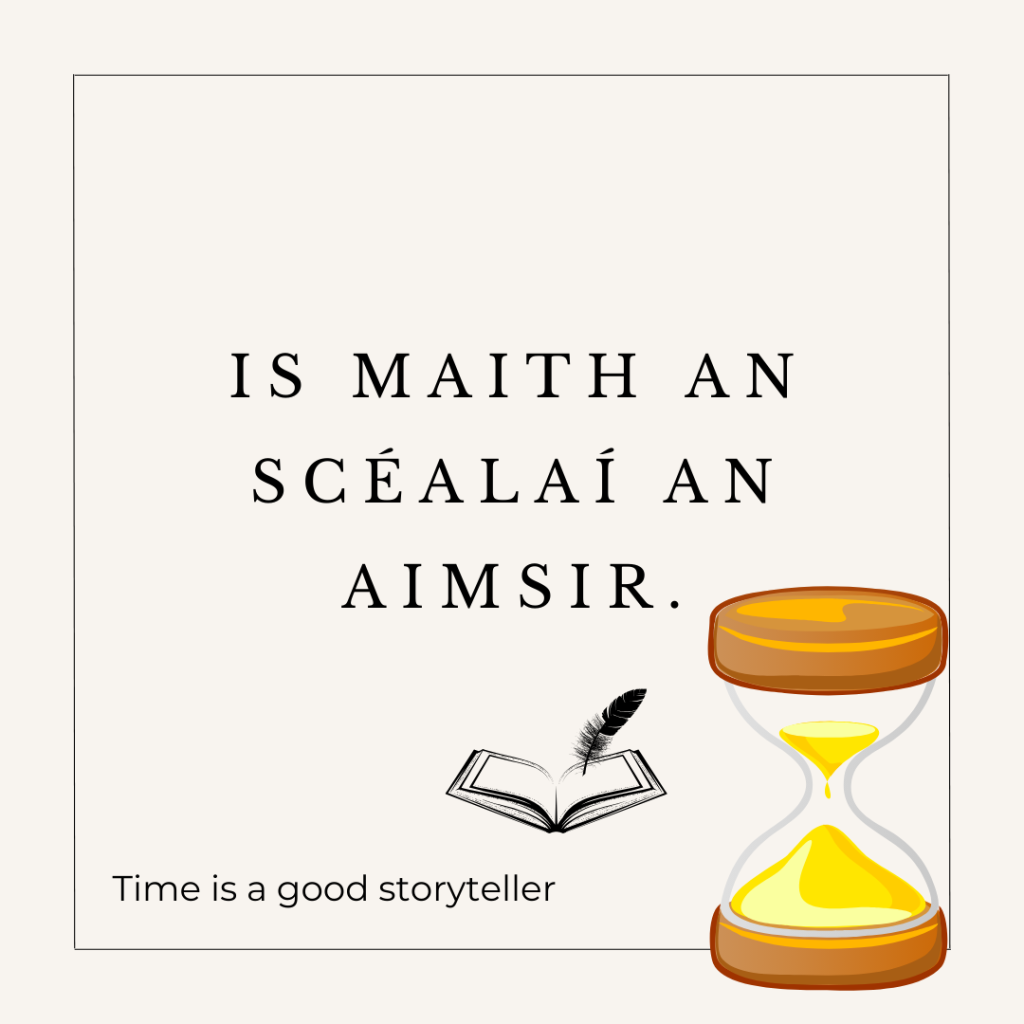 Let’s look at some of the most succinct Irish quotes like the one above. The English equivalent would be “time will tell” but the Irish language beautifully reimagines time.